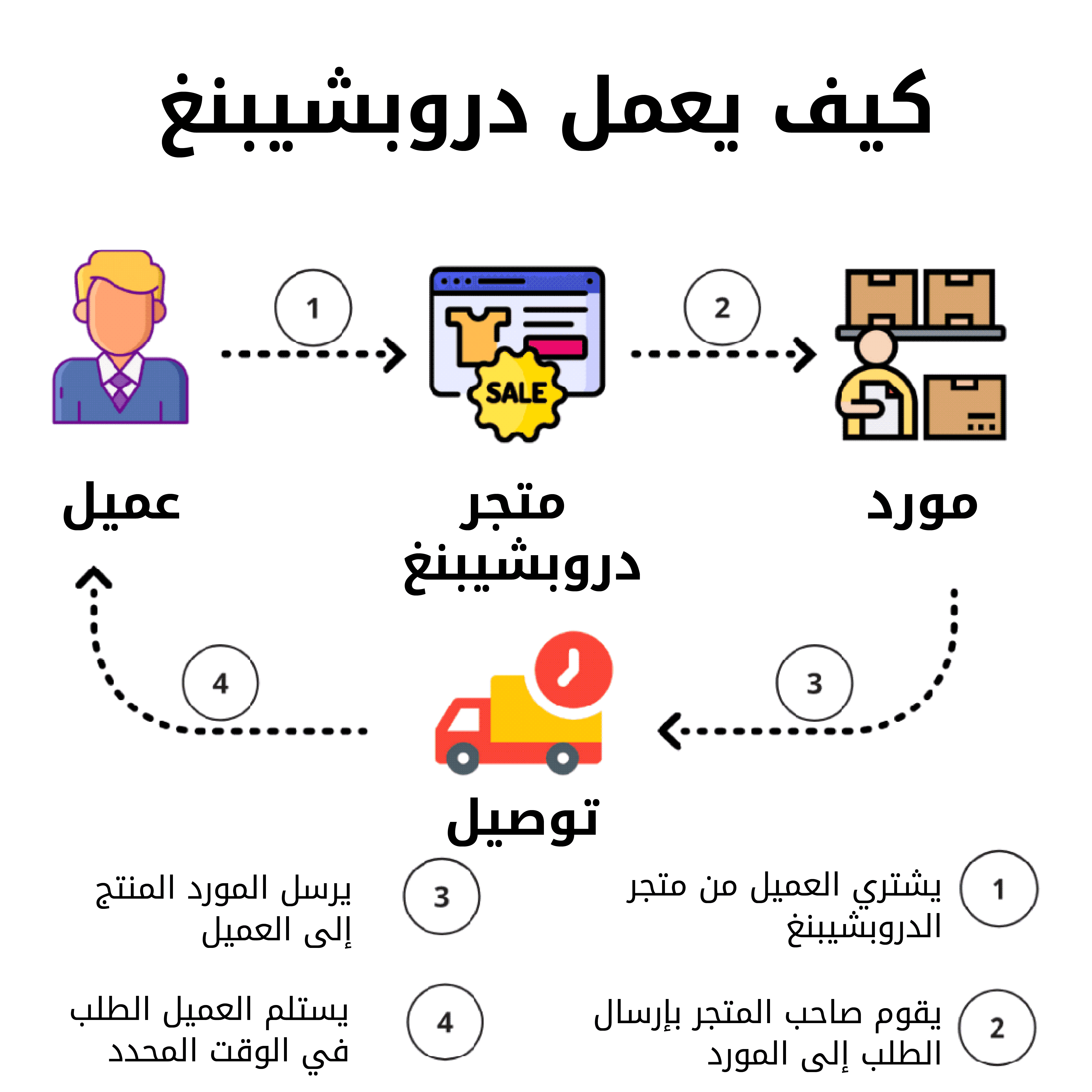 التاجر "صاحب المتجر إلكتروني" يبيع المنتجات عبر موقعه على الإنترنت بينما يقوم المورد ("مصنع" ، "تاجر جملة" ، "مستورد السلع") بإرسال الطلبات و إستقبال الطلبات الراجعة (retours/returns) في حالة عدم رضاء العملاء.